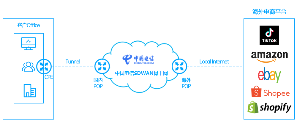 基于中国电信SDHWAN全球骨干网构建加密隧道,实现国内办公网与海外电商平台的专线级连通,有效规避公网拥堵与链路波动,保障业务访问稳定性。